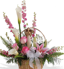 New Baby Vibrant Hand tied or Vase. Asiatic Lilies, Carnations and Freesias in delicate shades of white and pink.
